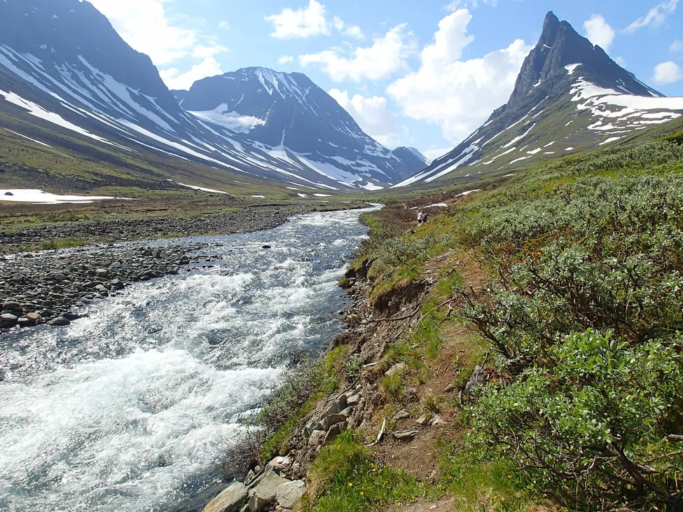 Jag har tidigare endast åkt skidor i denna dal och då upplevt den som lätt att ta sig fram i. Sommartid är det dock mycket videsnår som ska passeras.