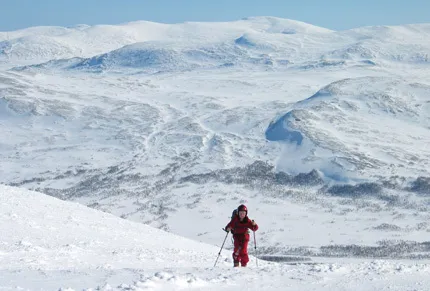 Första telemarksturen för min son, Liam, nästan uppe på Getryggens topp (Storulvån, Jämtland). Ett stort äventyr för en 9-åring!