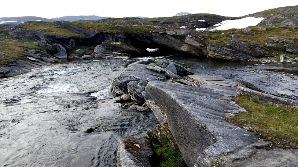 Vid Råvejávvres utlopp finns denna gigantiska stenbro. På andra sidan bron finns en naturlig grotta som mycket väl kan fungera som övernattningsplats.