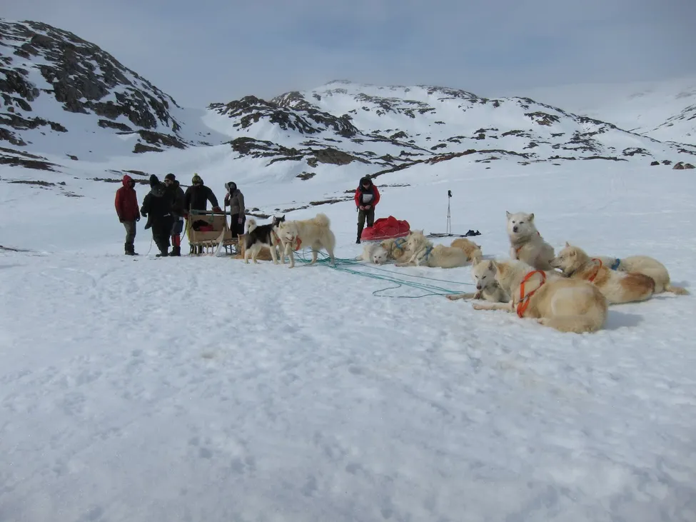 När det var dags att svänga västerut mot den plats där vi morgonen efter skulle bli hämtade för båtskjuts över Sermelikfjorden. Träffade vi en Inuit som visade vara svärfar till den person som skulle skjutsa oss över fjorden. Vi fick beskedet att det inte gick att åka över fjorden där vi planerat eftersom packisen var för kompakt. Chanserna att ta sig över fjorden skulle vara bättre från Tiniteqilaaq. Efter lektion i att hantera en sju meter lång hundspannspiska och några historier om hur många narvalar svärfadern fångat från kajak med harpun, respektive hur många isbjörnar han fällt for vi vidare norrut i stället för västerut.