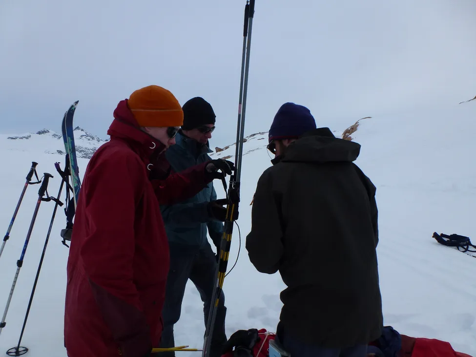När David påbörjade nedfarten visade det sig att även den var brant – brantare än väntat. Detta ledde till skackelbrott, men som väl var höll David. För att få ihop glasfibern som var i småsmulor på två ställen och det tvärgående järnstaget som också gått av gjorde vi slut på sju tältbågsdelar och ett par tejprullar. Vi höll alla tummar för att reparationen skulle hålla.