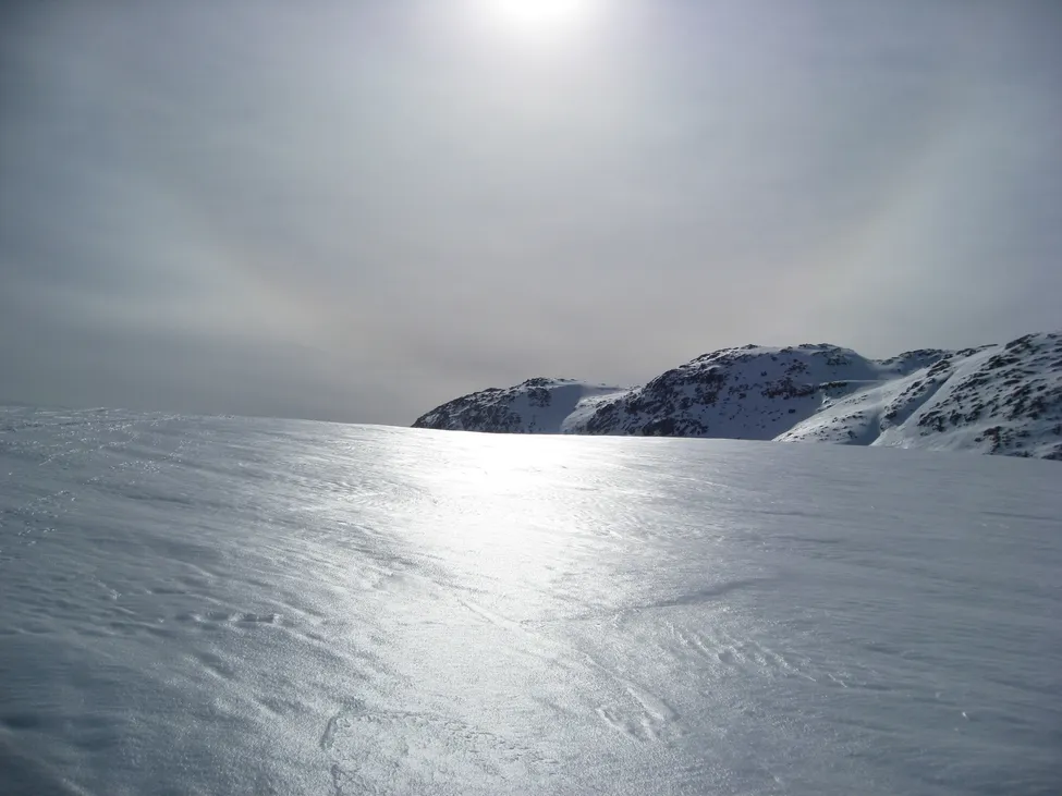 Skaren är hård men bitvit bristande. Haloeffekt runt solen. Det brukar vara ett tecken på att blåsigt väder är på väg. Hoppas att det inte blir någon Piterak.
