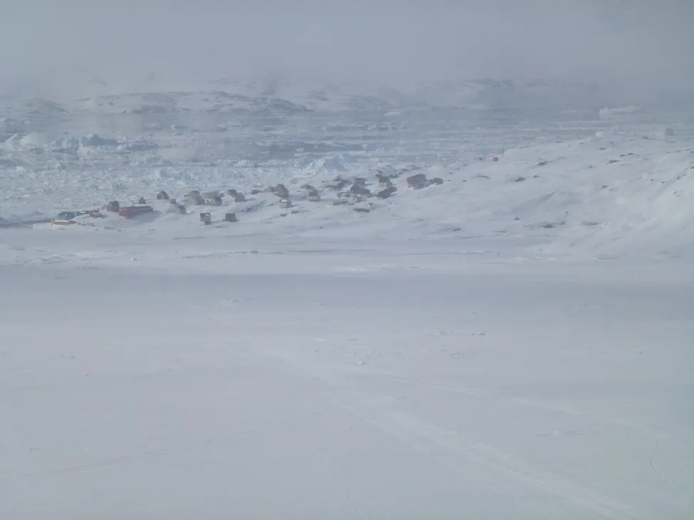 Tiniteqilaaq syns på udden. Bra att det är ordentligt med is på den lilla fjord vi behöver skida över för att komma till Tiniteqilaaq. Mindre bra att det verkar vara tätt med isberg på Sermelikfjorden bortom Tiniteqilaaq.