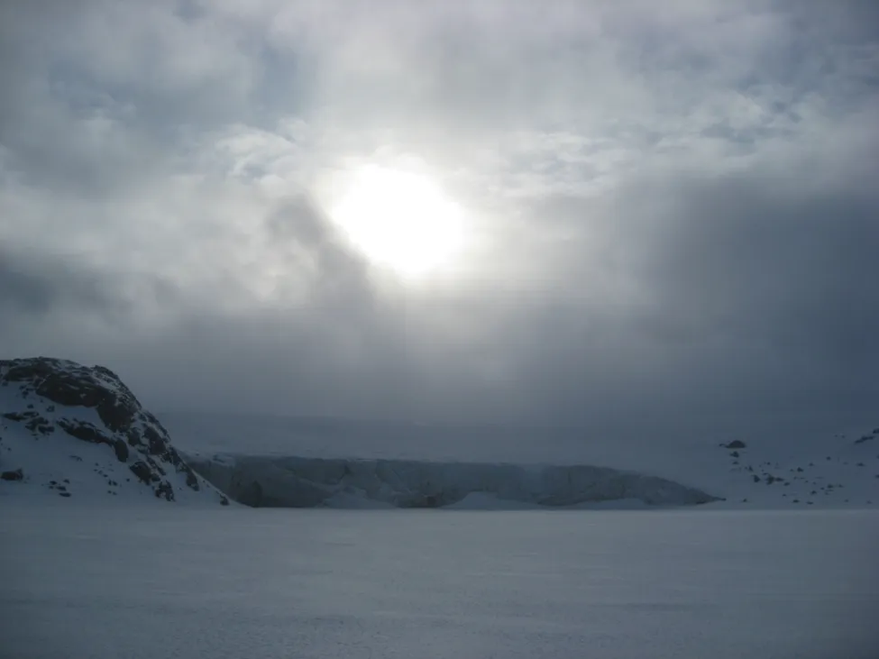 Jo, på detta. Dalen är avskuren av en hög kalvningsbrant. Så här borde inte en vanlig glaciär bete sig. Det är inte någon vanlig glaciär utan en inlandsisen.