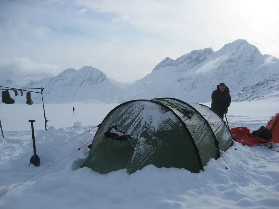 De spetsiga bergen omger sjön nedanför isen. Precis bakom bergen ligger havet.