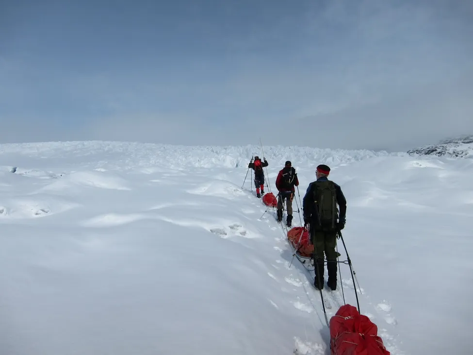 Vi hade sett ut en linje att gå upp på. Micke gick först med sonden och vi var inknutna. Micke stack ner sonden i snön för att känna efter om fanns fast botten.