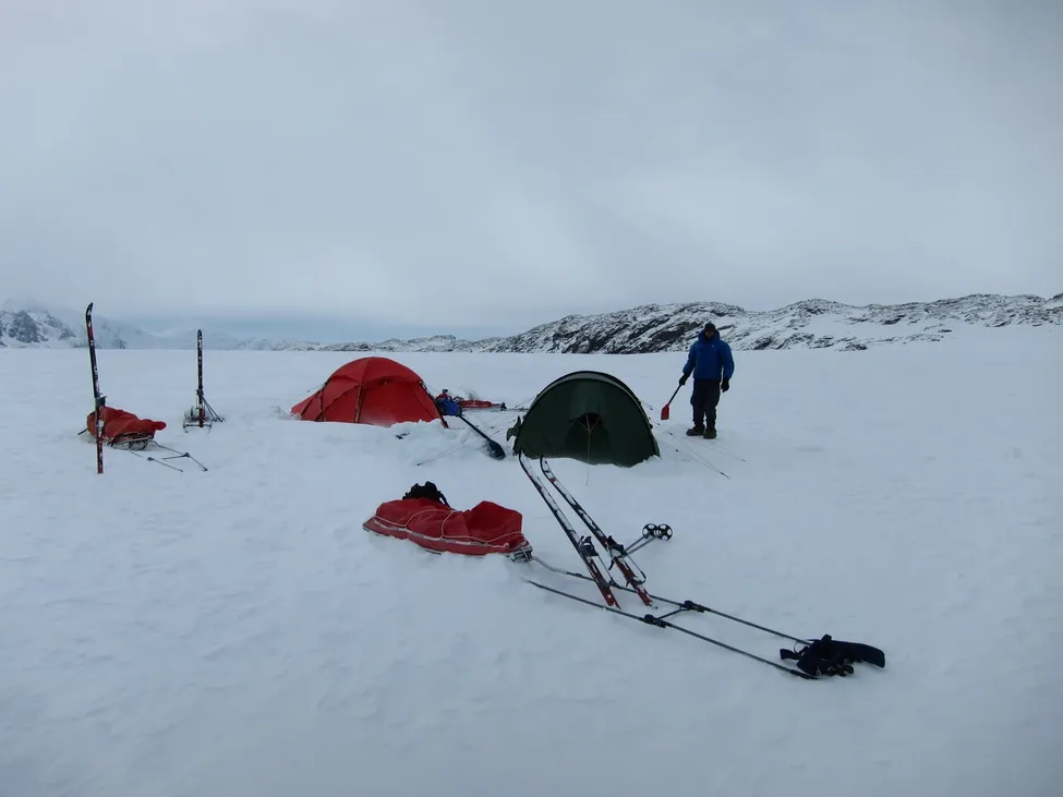 Som vanligt var tälten väl förankrade i snön och larmlinorna uppsatta på skidorna för att varna för närgången isbjörn.