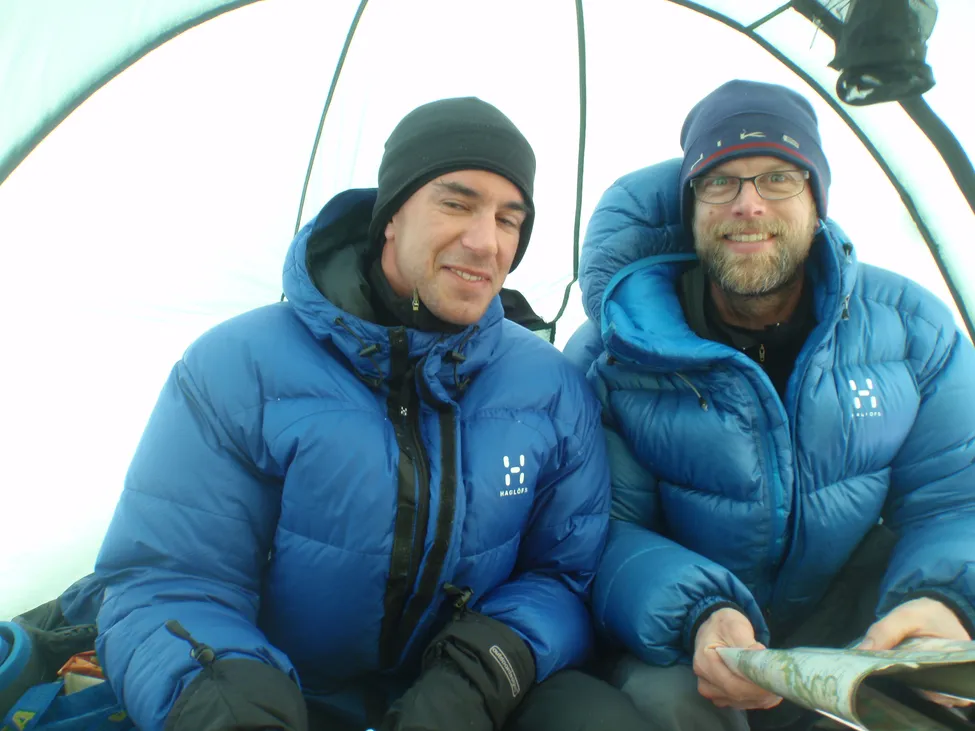David och Micke planerar dagens tur inne i ett av tälten