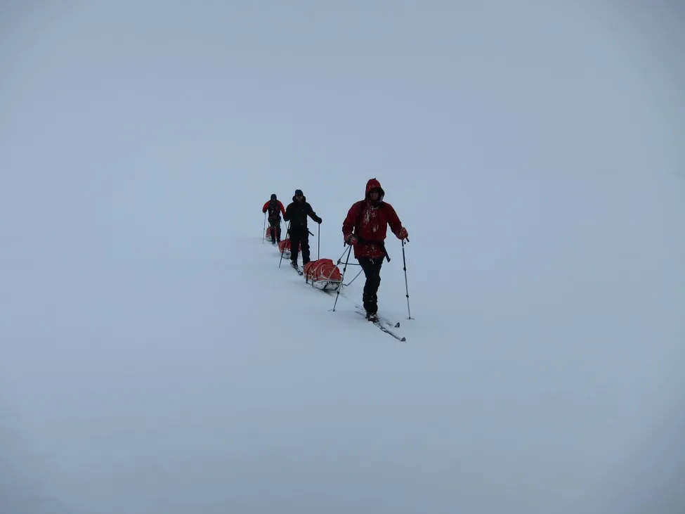 ...och ibland inte. Men allt var lika vitt för det. Det var lite svårt för balansen att gå först utan referenspunkter. Vi gick på kompass.