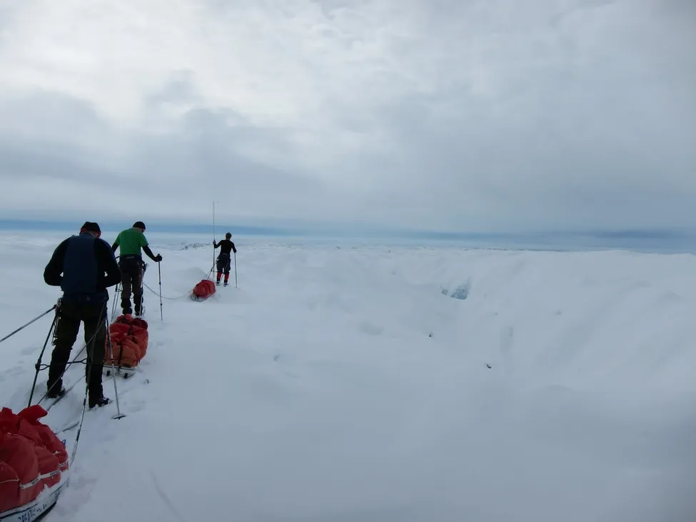 Det var delvis ett svårt sprickparti som vi behövde passera. Vi hade samma taktik som vid uppgång på glaciären. Micke med sonden.