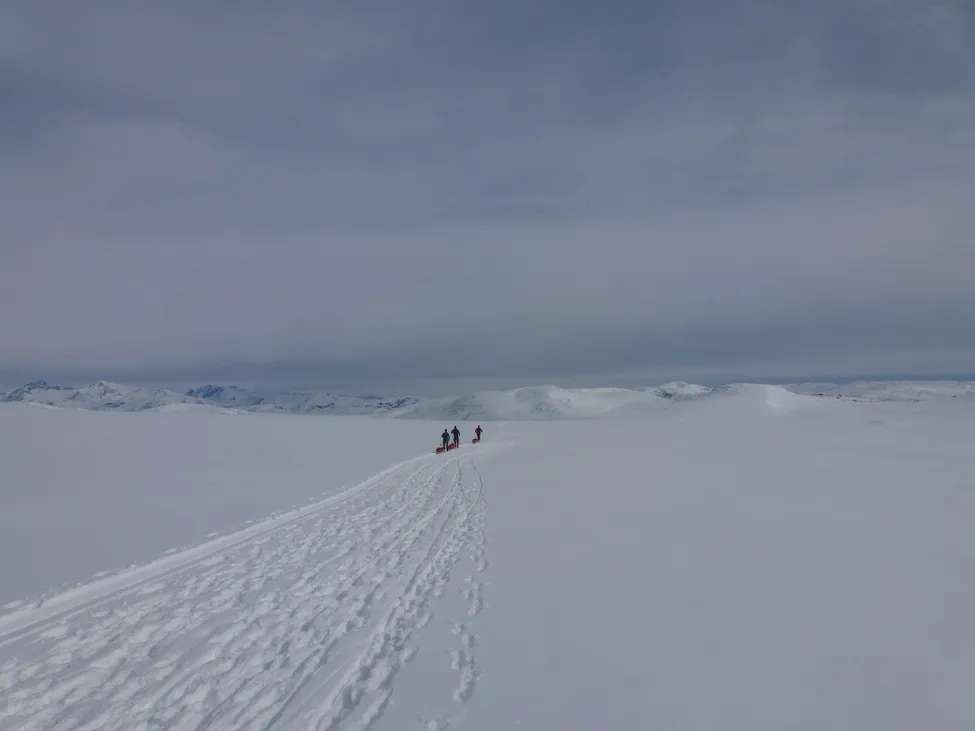 Efter sprickpartiet stötte vi ihop med ett hundspannspår. Vi följde det ner längs glaciärkanten. Nästan nere vek vi av mot ett litet bergspass.