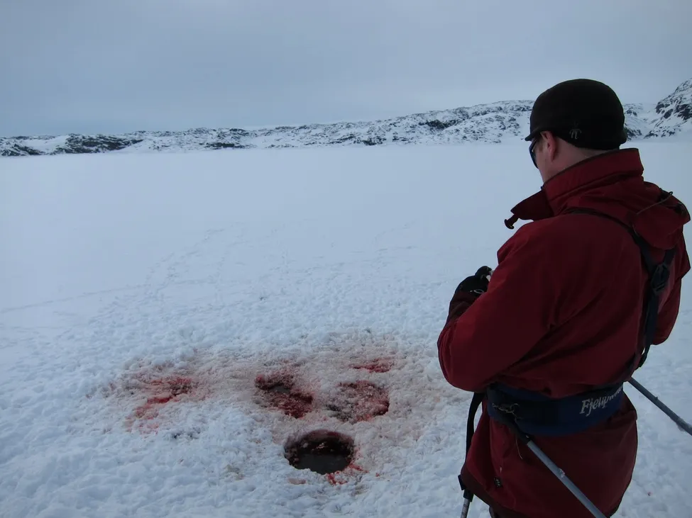 Vi såg ganska snart ett lufthål från en säl och att sälen hade skjutits. Vi såg en levande säl långt bort vid ett annat lufthål.