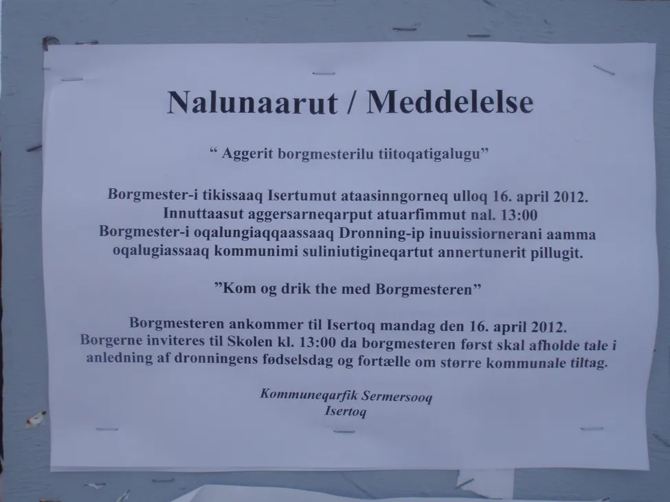 Vi upptäckte vi detta uppsatta meddelande att byn skulle få besök av huvudstadens och denna bys gemensamma borgmästare för att fira danska drottningens födelsedag