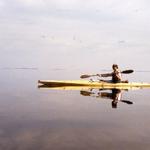 Lasse och träkajak på ett löjligt spegelblankt Ålands hav i augusti 2002. Tryckande hetta och vindstilla i tre dagar.