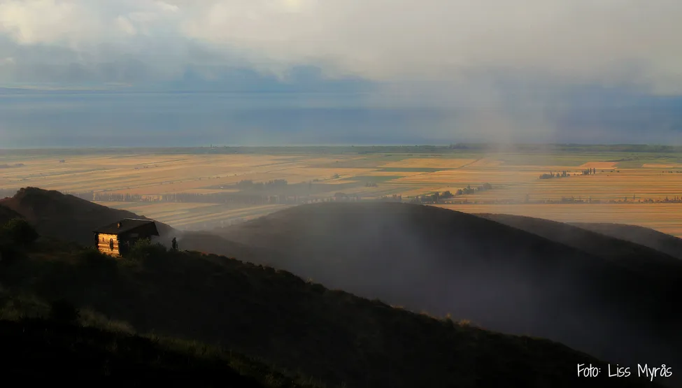 Morgonvy av djurvaktarnas stuga mot Issyk-Kul lake