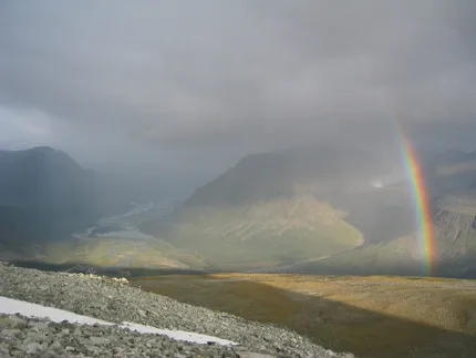 Sofie och jag har precis korsat Jågåsjgaskajiegna och får äta middag i solsken när ett litet oväder drar över rapaselet.