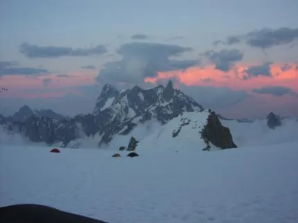 Dent du geant och grandes jorasses syns i bakgrunden. Bilden tagen från tältplatsen på Col du midi, nedaför
