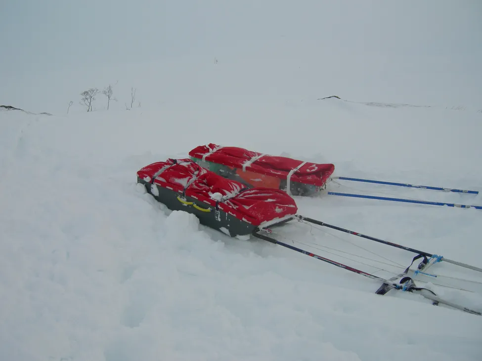 Jag bockade pulkan själv med en varmluftspistol och fäste ihop allt med popnit. Tyckte att det var smidigt att göra själva pulkan men mycket mer krångligt att få till ett par hållbara och ihopfällbara skacklar. De två första varianterna av skacklar gick sönder när jag var ute på tur.