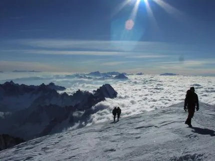 Två okända klättrare som tar de sista stapplande stegen upp på toppen av Mont Blanc.
