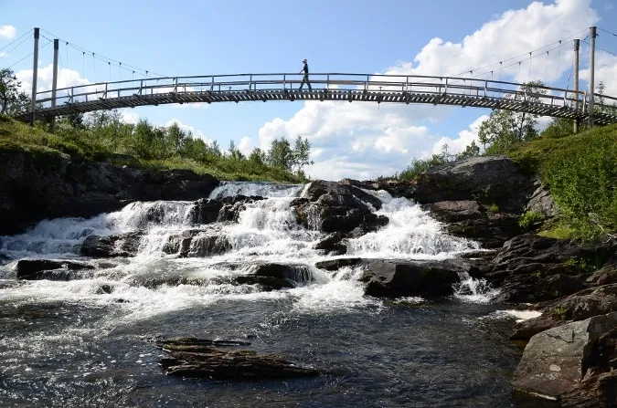 12. Hängbro över Servvejuhkka. Grymt bad nedanför det stora vattenfallet som inte syns i bild.