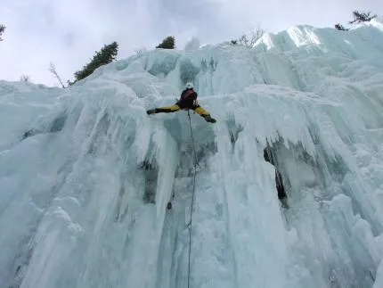 Stefan klättrar i Klövsjö, Fettjeåfallet. Han klättrar på det högra fallet längst upp.