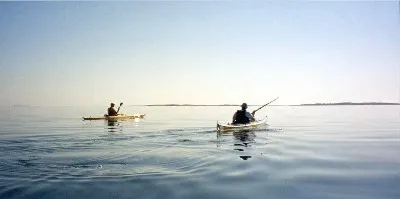 Ännu en bild från Ålandspaddlingen i augusti 2002. Lasse och Anders på ett spegelblankt Ålands Hav. Mer om paddelturen kan du läsa här: http://www.utsidan.se/ddb/lashorna/visa/682.htm