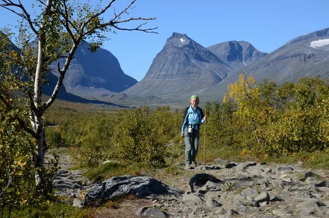 21. Vandring i höstfärgad fjällbjörkskog mellan Kebnekasie fjällstation och Nikkaluokta.