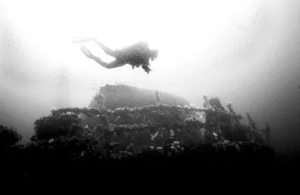 Helena Samuelsson under ett dyk på vraket "Konsul Carl Fisser" som ligger utanför Ålesunds hamn.