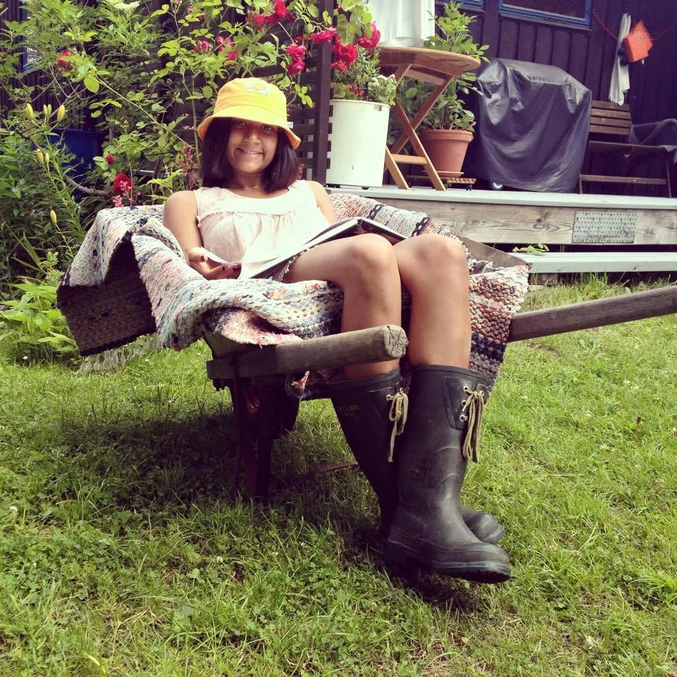 Sitter i en kärra och läser en bok