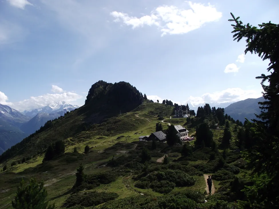 Njutbar vandring mot Riederfurka. Riederhorn (2230 m.ö.h.) dominerar blickfånget.