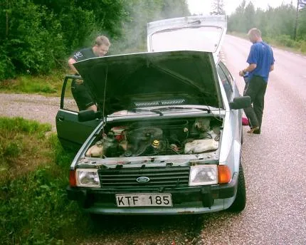Har precis släckt en mindre motorbrand på en Ford Escort -81, någonstans i Sverige, på vår resa Luleå - Barcelona.