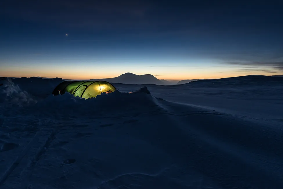 Venus har tänts på himlen, tältet är rest, tältlyktan är också tänd, den hårda snön knarrar och jämrar sig under fötterna, kylan river som kattklor i kinderna och allt är väldigt, väldigt tyst.