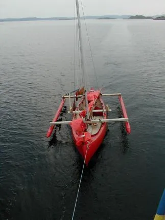 Dessa pontoner är ett snabb-bygge, en prototyp, för att se om det överhuvudtaget var möjligt att segla båten. Plaströr med fastlimmade 1,5 liters plastflaskor.. :-))