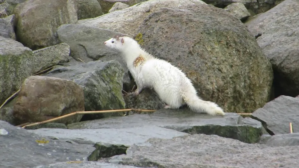 En mink sprang och hoppade omkring på stenarna nere vid hamnen, men stannade till ett litet tag.