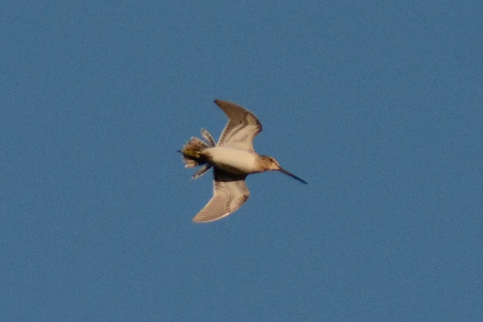 Så här ser Enkelbeckasinen ut när den sträcker ut stjärtfjädrarna och gör sitt speciella bräkande ljud med dom. Anledningen till att den brukar kallas "Himlafåret"