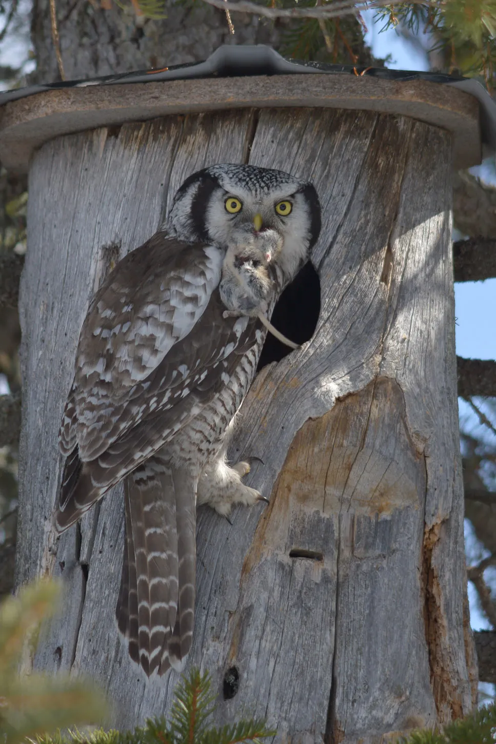 Ett underbart naturmöte med Sveriges dagaktiva mest aggressiva uggla... Har haft förmånen att studera dom från 5 meters håll då dom häckat i en knipholk.