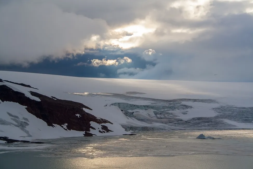 En bild från sydöstra delen av Skagmadalen. Sjön ligger på 935 meters höjd och en glaciärtunga kalvar små isberg vars synliga delar kan vara 5 meter höga. Jag sitter vid min tältplats på 1050 meters höjd och facineras av det ständigt växlande ljusspelet över isen.