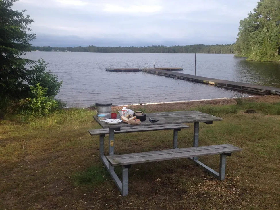 Badplatsen vid Sjön Fegen .Frukosten är klar att intagas. Hyfsat bra väder och ett morrondopp samt en god och nyttig frukost så känner man sig ung och rask igen!