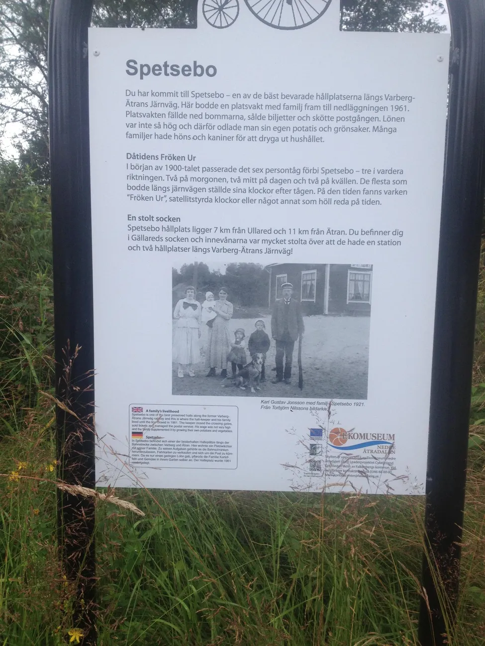 En historisk beskrivning om Spetsebo Järnvägsstation. Skylten belägen vid cykelbanan invid stationen.