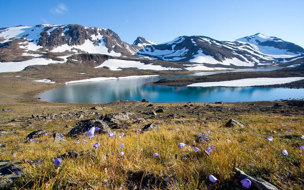 Sjö 976 har inget utlopp så vattnet sipprar väl genom marken ner till den 7 meter lägre liggande Stádák en halv km österut. Den här dagen gjorde jag en rekogniseringstur för att hitta en lämplig väg upp mot Suliskongen. Tog mig upp på toppen (1908 meter) dagen därpå i strålande väder.