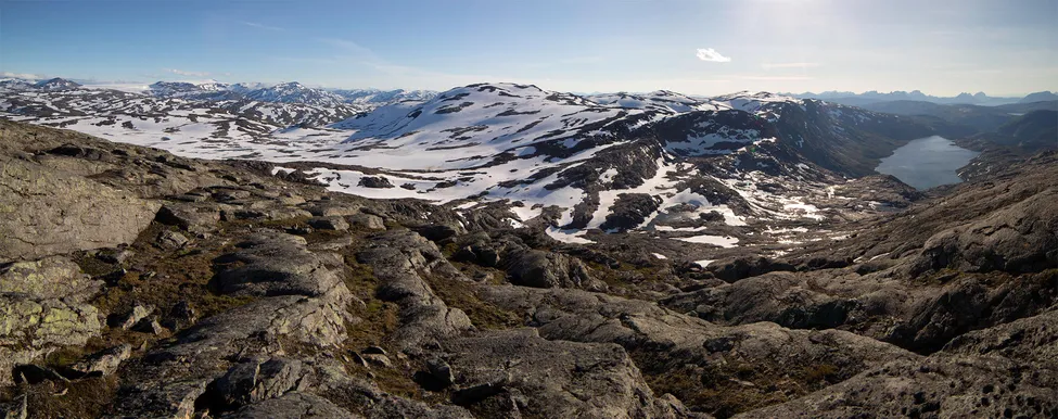 En bild tagen från södra delen av berget Litlrago, från cirka 1180 meters höjd mot sydväst. Berget i mitten är Goadásjoajvve (1220) som ligger vid östra änden av Lappfjellet i södra Rago. Linné gick här år 1732 och under kriget användes leden av norrmän som flydde undan tyskarna. Leden går på norra delen av Lappfjellet - nära stupet ner mot sjön Litlverivatnet och vidare österut mot Virihaure. Man går i princip bara över rent urberg och snöfält och leden är sparsamt markerad med små stenrösen. Ett år som 2015 med en exceptionellt sen snösmältning kan många rösen vara gömda under snön och leden bitvis vara svår att följa.