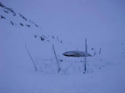 Vindskjerm er bygd for å beskytte teltet mot vinden som var meldt på natten