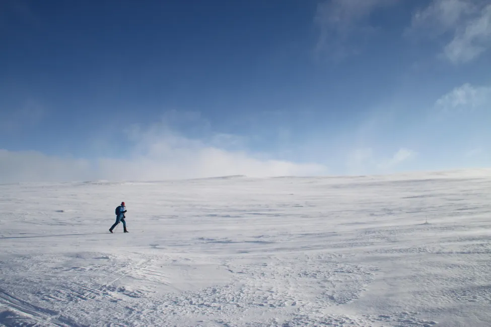 Här åker jag skidor i Grövelsjön. Starka vindar och snön dansar sig fram på vidderna.