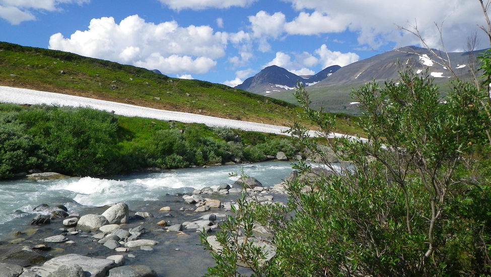 Vid bron över Vierrojohka, På väg upp mot Mårma. I bakgrunden syns min tidigare färdväg ut från Siellavággi. (just där grenen uppe till vänster pekar)