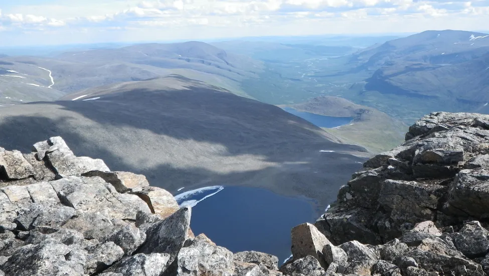 Nedre Vistasvagge, med sjöarna Vássaloamijávri och Vássačorrujávri på rad ovanför, sett från toppen 1777 på Vássačorru.