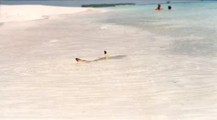 Liten black-tip reef shark som jagade fisk vid strandkanten..