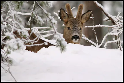 Tycker om dina bilder på våra vardagsdjur. Fin skärpa men något omättade färger. Den här är fin med bocken som nyfiket tittar upp bakom snödrivan. Lägg ut fler sådana.
