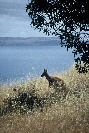 En känguru tar igen sig och blickar ut över Kangoroo Island söder om Adelaid i South Australia.