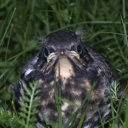 Upptäckte denna försvarslösa Björktrastjuvenil liggande under en buske. Jag kunde krypa så pass nära att jag tog bilden i macro-läge.
