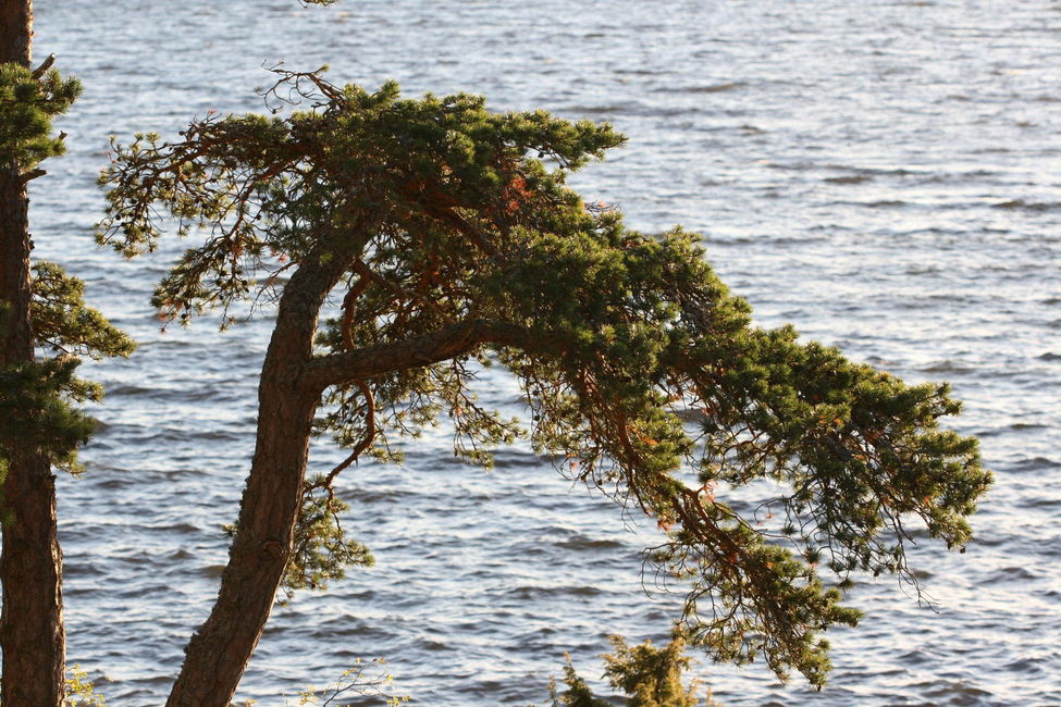 Vindpinad tall på Braxenberget, som är en populär plats för rekreation på sommaren.